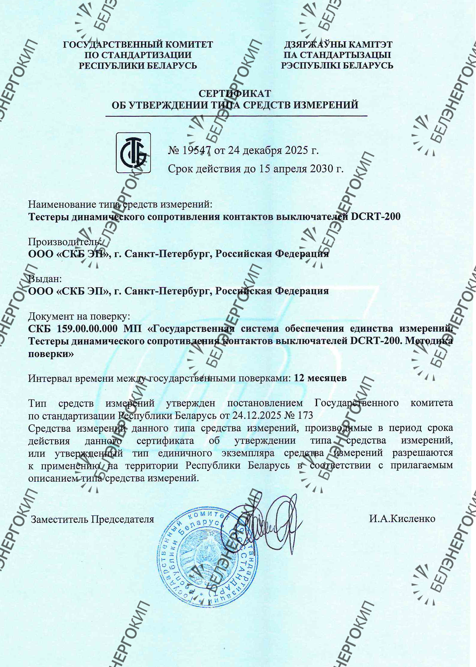 Тип средств измерений утверждён постановлением Государственного комитета по стандартизации Республики Беларусь от 24.12.2025 №173
